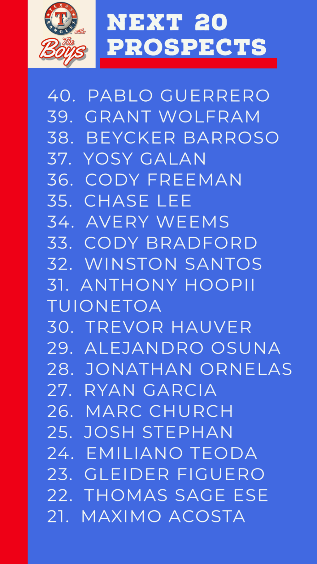Today is our #Next20 list! Kevin and Manimal run down the next 20 prospects in the Rangers farm system
